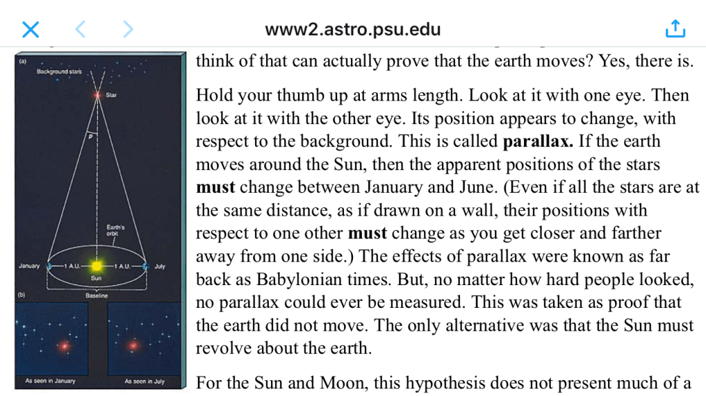 Stellar parallax is used to “verify” that the Earth is moving but it’s dependent upon the A priori assumption that the Earth is moving. In case you weren’t sure, that’s circular reasoning.