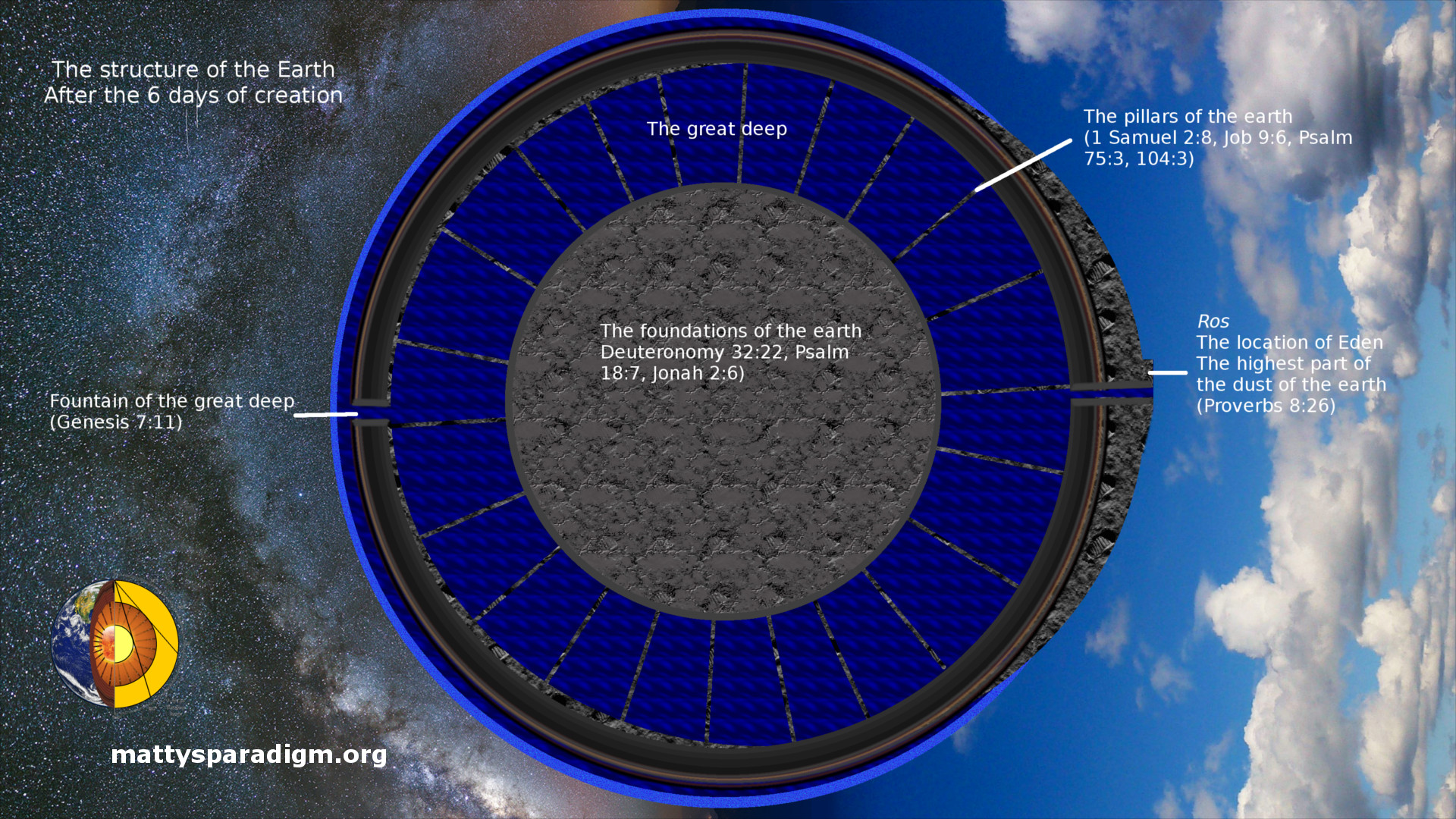 We worked on the idea that the original Earth was shaped as one large mountain some time in 2000 when we were the Custodian in a church. We were sweeping the balcony one day when we realized that rivers flowing from Eden that watered the whole Earth must have started at the highest point. We’re not sure when the penny dropped that this was the reason why several prophesies foretell a return to this condition, but it has to have been by December 2003 because we started making notes about it.