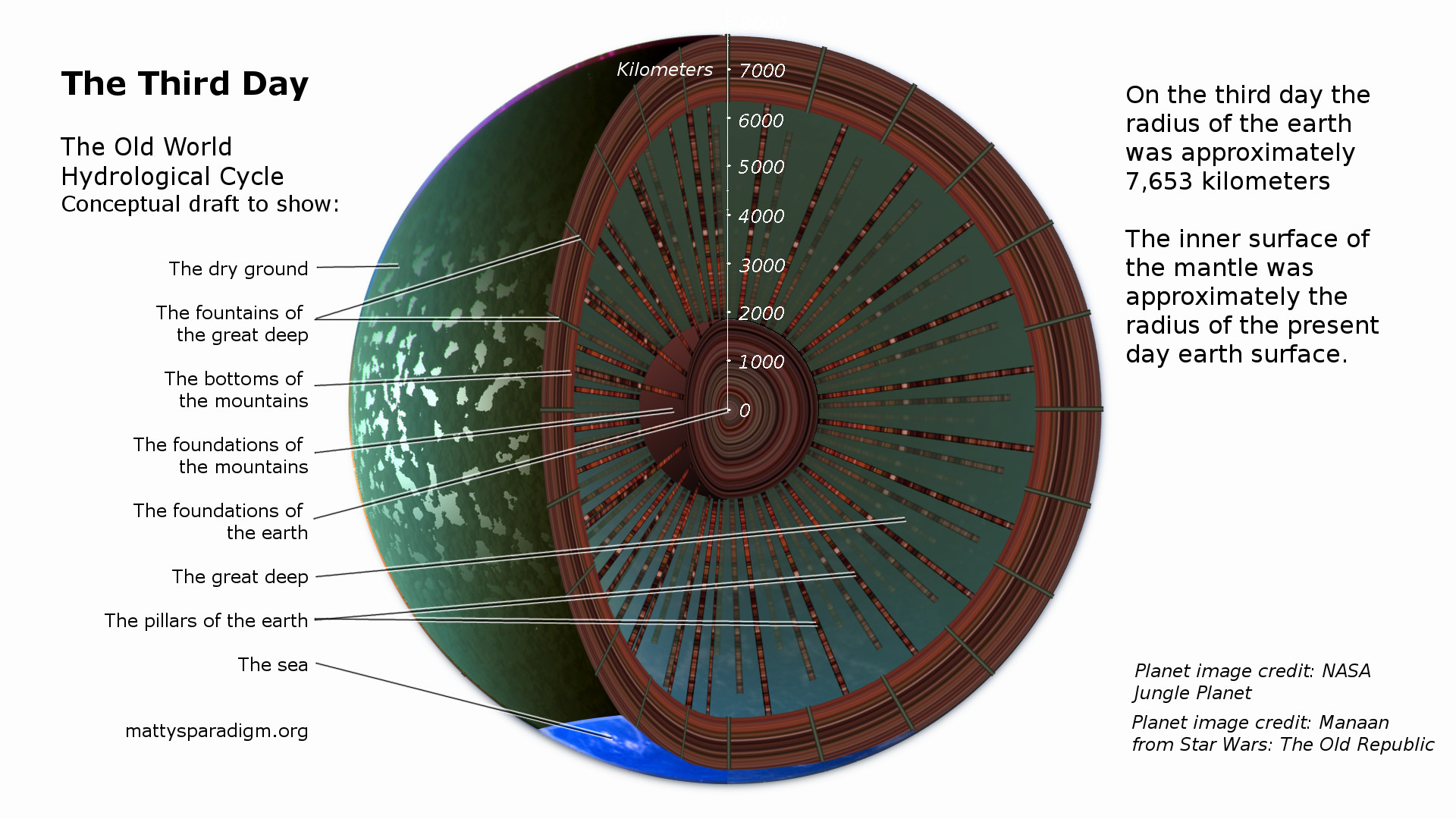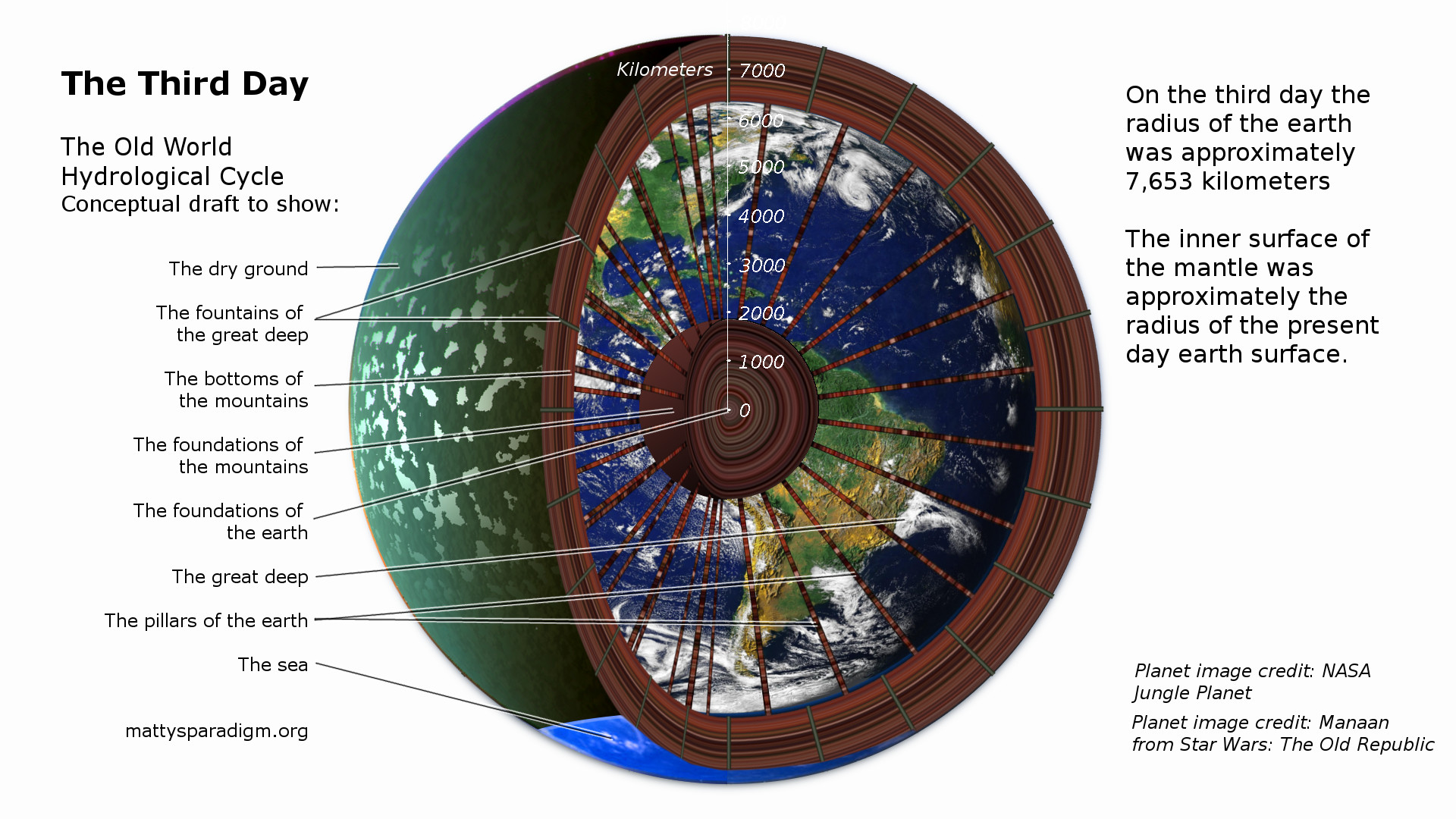 The Earth on the third day of creation had a radius of about 7,653 km. This is 1,282 km larger than the radius of the present day Earth. Present day Earth would fit inside the Earth as it was created on the third day.