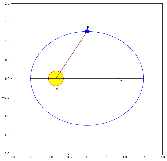 The geometry of the movement of the celestial bodies have been quite well understood since Kepler formulated his well known laws back in the 17th century. They state the planets move around the sun following an elliptical trajectory, with the sun sitting at one of the ellipse foci. In the next figure, we see an (exagerated) elliptical orbit, with its two foci marked as “Sun” and “F2”. An hypothetical planet is also shown over the orbit line.