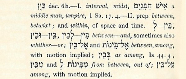 - I. interval, midst, a middle man, umpire 1 Sa. 17. 4