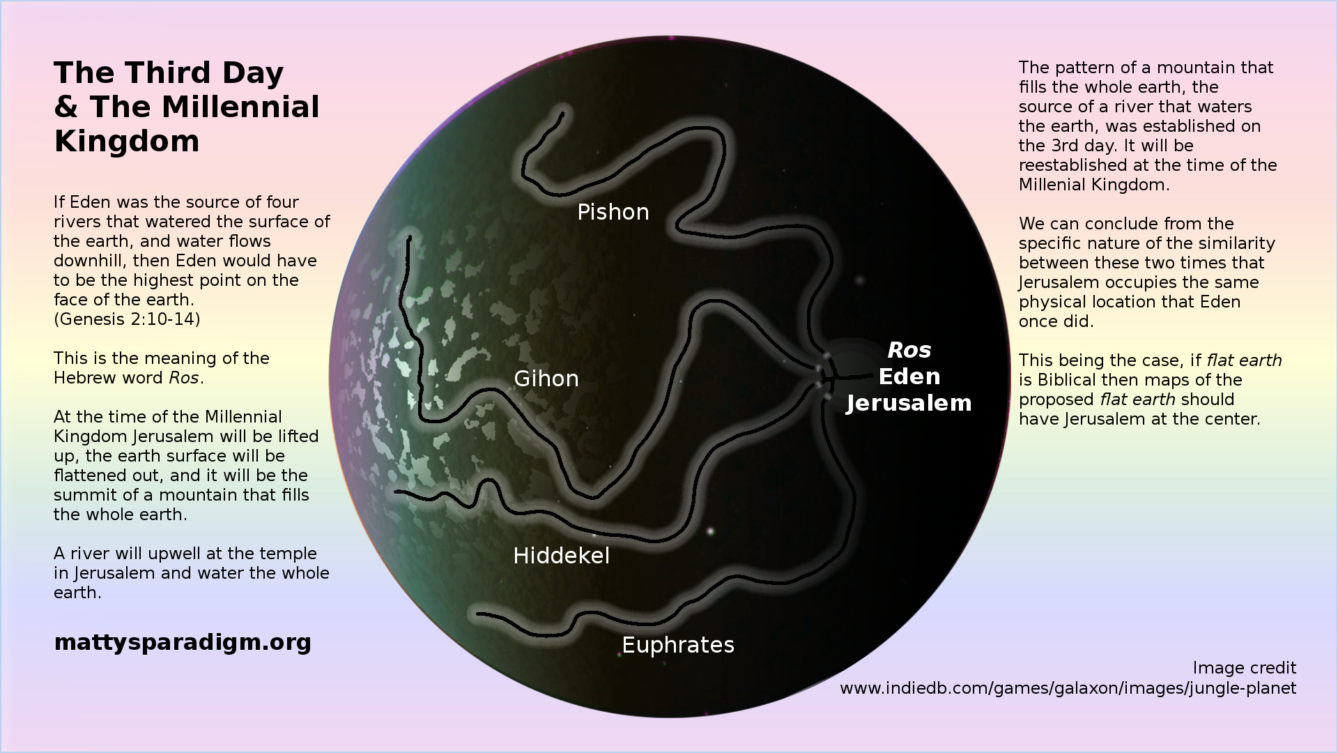 When we consider the similarities between the 3rd day and the Millennial Kingdom we should realize that, if flat earth is Biblical, then maps of the supposed flat earth should have Jerusalem at the center. They don’t.