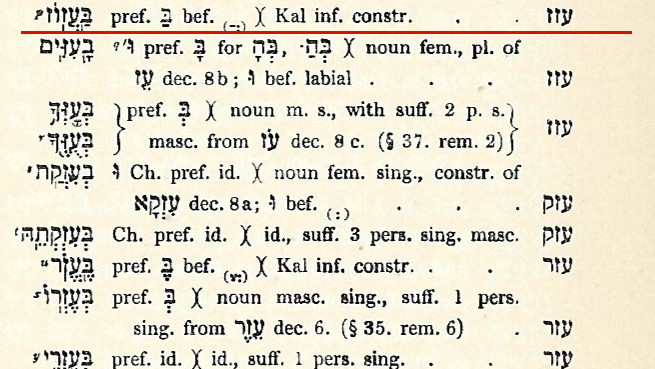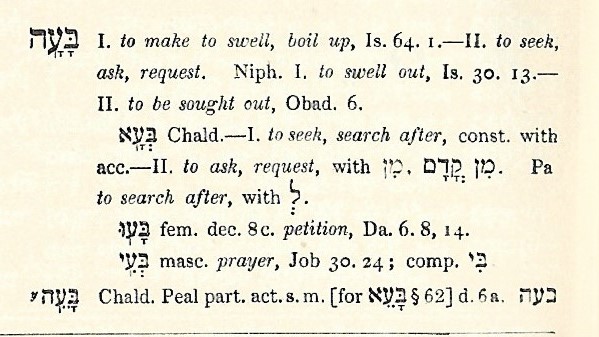 The root azaz has meaning which fits the context, but it’s lacking in nuance. If we search for the word as it’s spelled, with its initial בַּ֝, we find something interesting. The word is listed under the root בָּעָה – baah meaning to inquire, cause to swell or boil up.