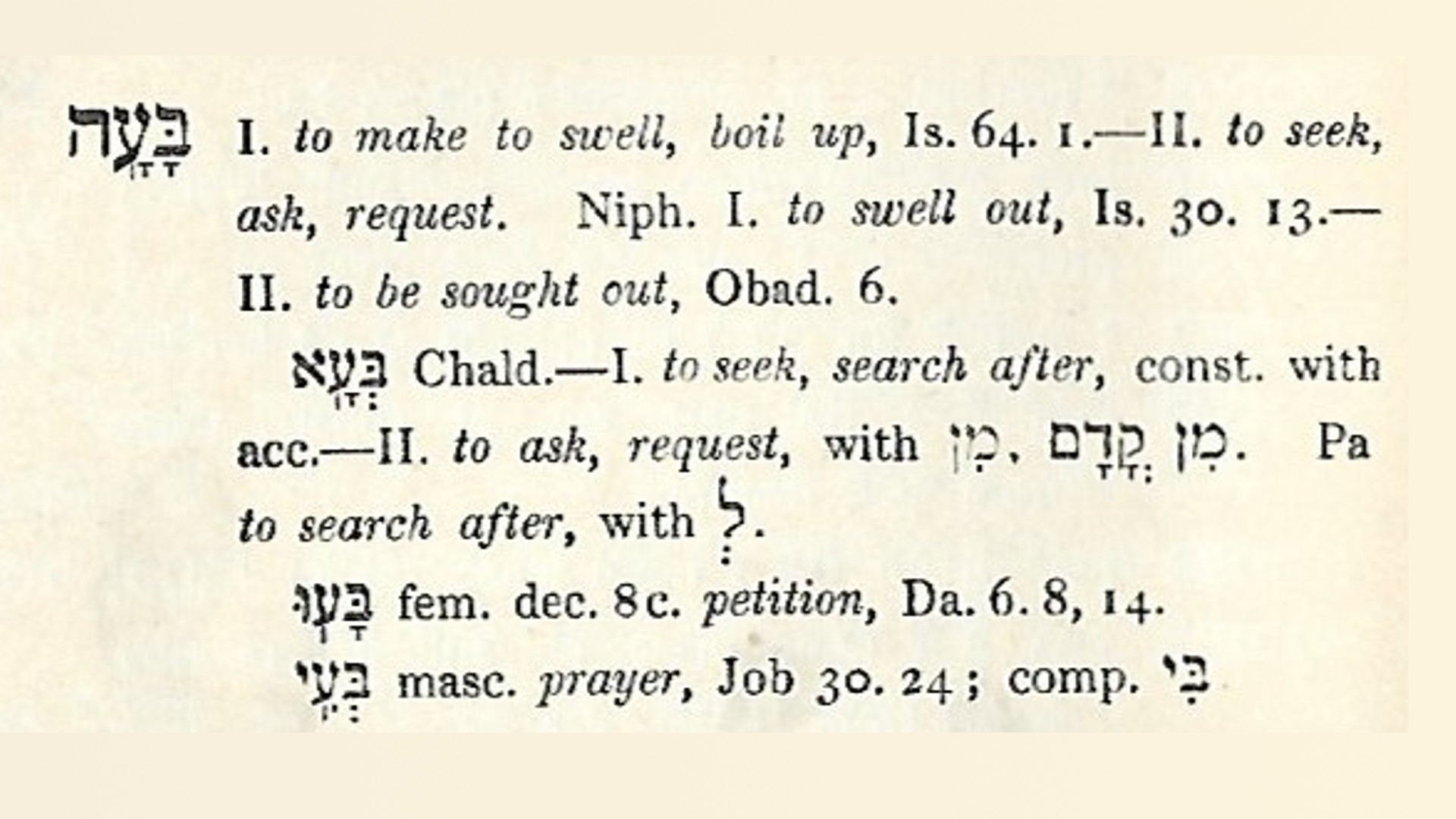 The root azaz has meaning which fits the context, but it’s lacking in nuance. If we search for the word as it’s spelled, with its initial בַּ֝, we find something interesting. The word is listed under the root בָּעָה – baah meaning to inquire, cause to swell or boil up.