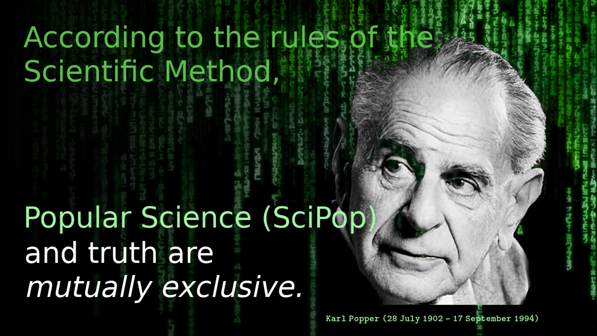 According to the rules of the scientific method, popular science (SciPop) and the truth are mutually exclusive. This is by design, it’s not an accident.