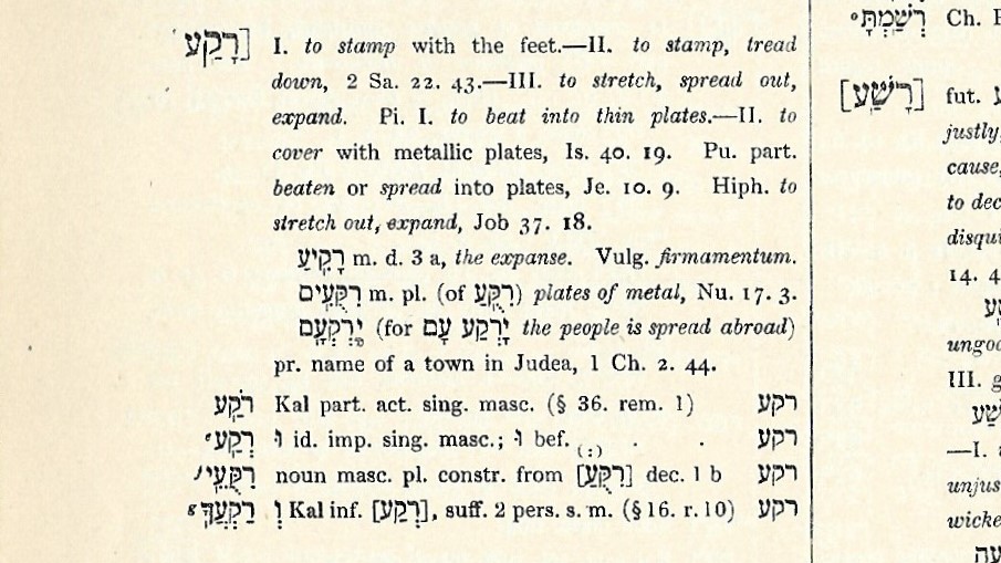 Suddenly we felt a burden to understand the original Hebrew to find out why the word translated as firmament in the KJV had been translated so differently elsewhere. Our copy of the lexicon came to us by remarkable good fortune, and while we spent an delightful 6 months homeless back in 2000 we taught ourselves enough Hebrew to be able find what we was looking for. It’s not easy though, so for future reference it’s page DCXCII (not kidding).