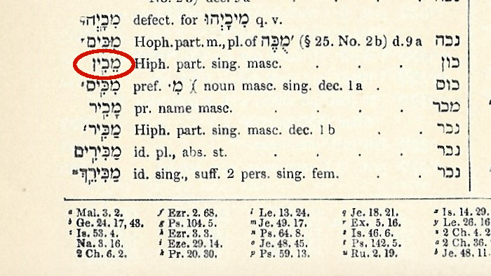 It just so happens (thanks Holy Spirit!) that on the same page is the root makak which means to sink. This just so happens (thanks Holy Spirit!) to match the spelling of our word mê·ḵîn. Now that we understand the role of gravity in creation and we know that it has a scriptural analog taba, it makes perfect sense for the word mê·ḵîn to be assigned to this root, in which case, alphabetically, it would be where you see the horizontal red line.