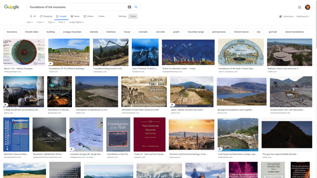 For the purposes of our model this makes the foundation(s) of the world synonymous with the foundations of the hills, the foundations of the mountains and what we saw Jonah refer to as the bottoms of the mountains.