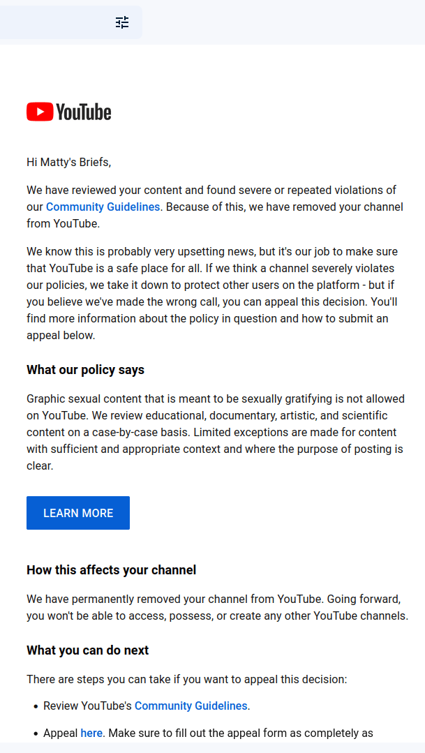 We know this is probably very upsetting news, but it’s our job to make sure that YouTube is a safe place for all. If we think a channel severely violates our policies, we take it down to protect other users on the platform – but if you believe we’ve made the wrong call, you can appeal this decision. You’ll find more information about the policy in question and how to submit an appeal below.