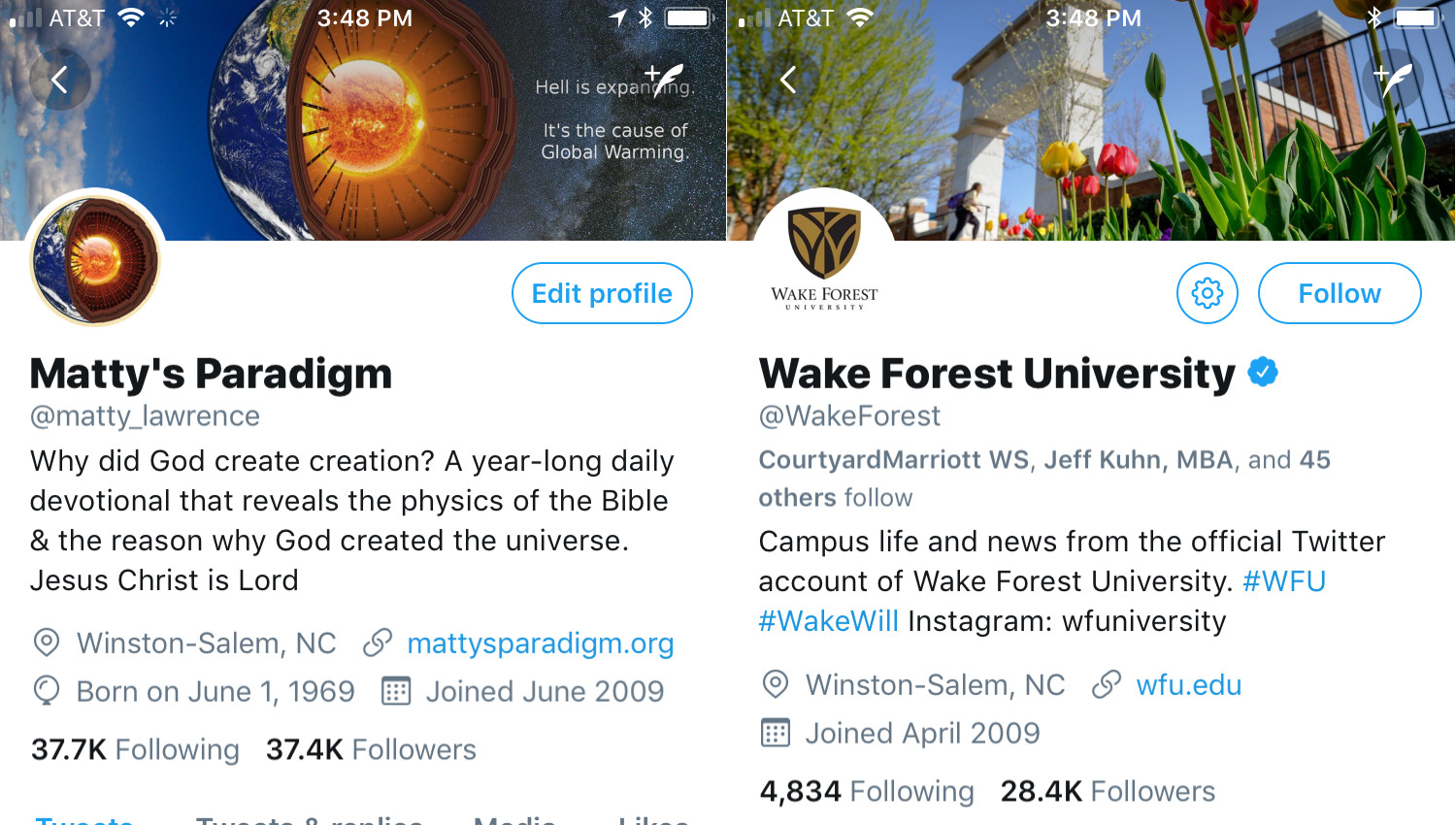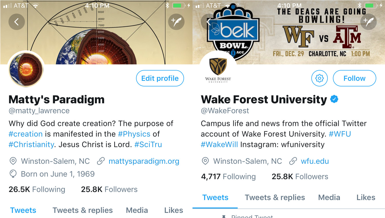 On that Day, December 11, 2017 I was almost equal to Wake Forest University in Twitter Followers. The screenshots here side-by-side were taken on December 19, 2017 eights days after I was fired.
