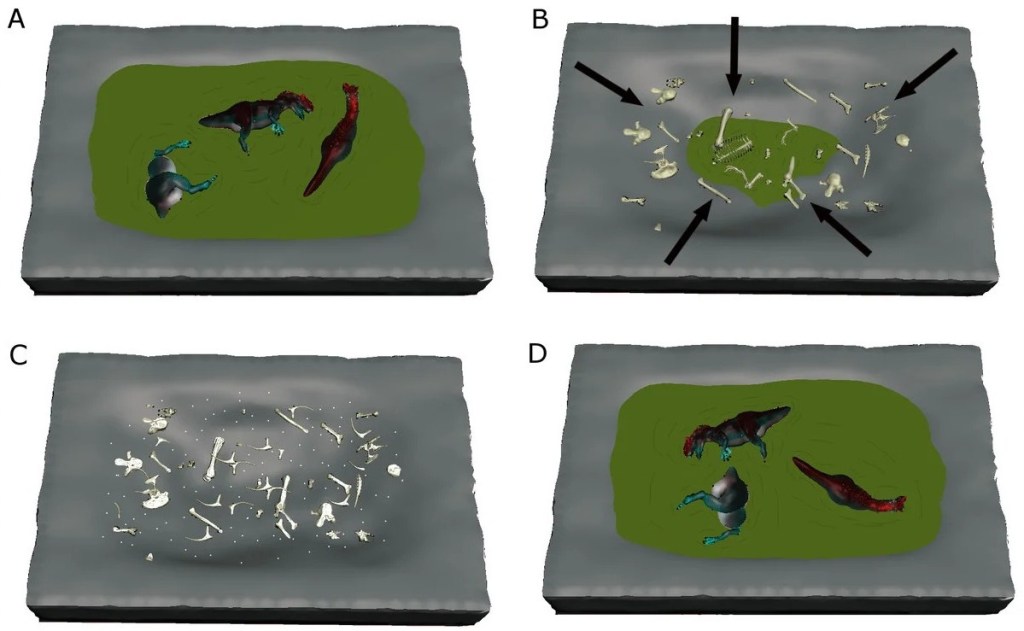 How the CLDQ bonebed was formed, starting with carcasses being washed in, bones being exposed, bones being weathered and broken into fragments, and the addition of more carcasses in the next flood stage. Credit: Peterson et al 2017