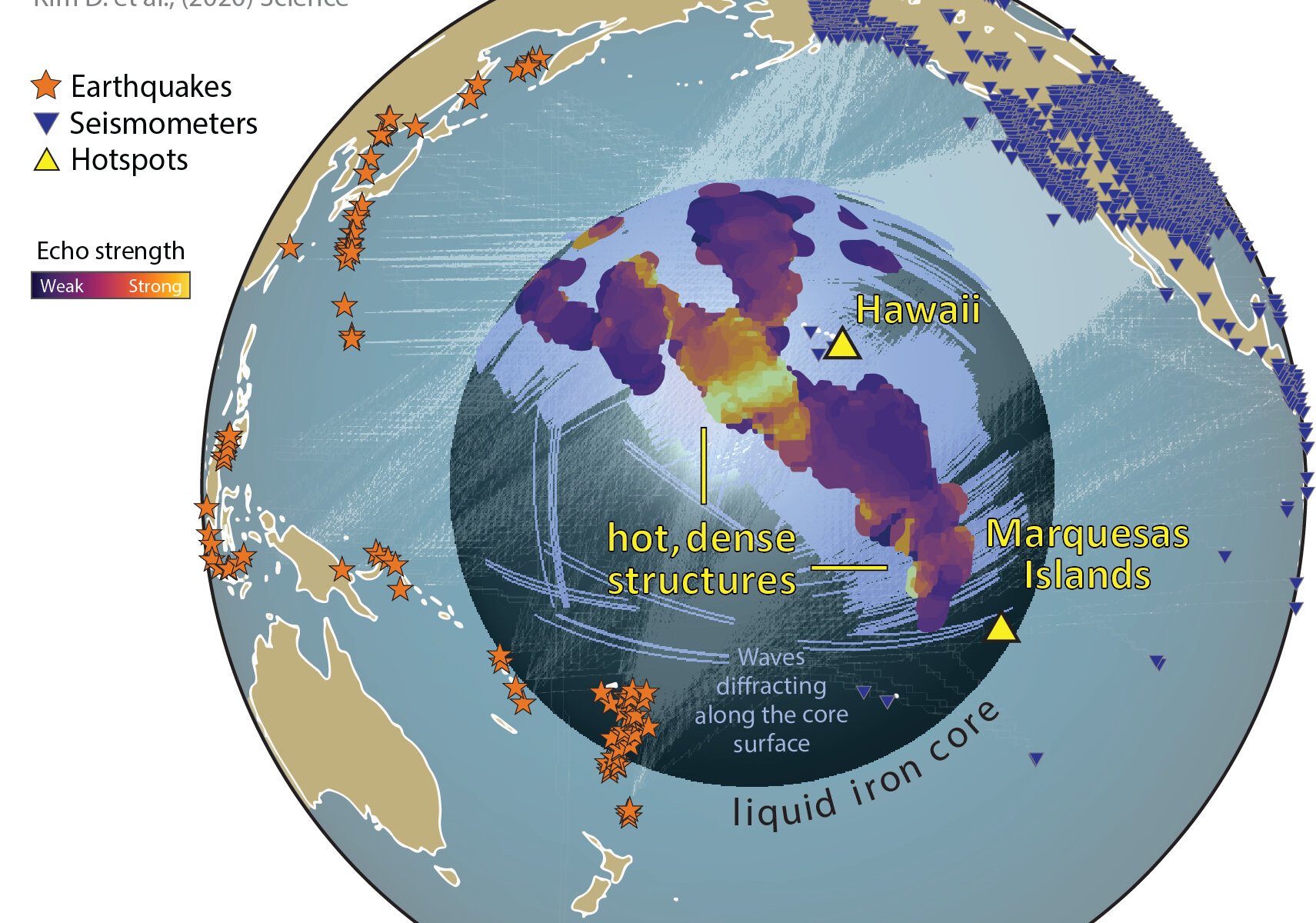 University of Maryland geophysicists analyzed thousands of recordings of seismic waves, sound waves traveling through the Earth, to identify echoes from the boundary between Earth’s molten core and the solid mantle layer above it. The echoes revealed more widespread, heterogenous structures—areas of unusually dense, hot rock—at the core-mantle boundary than previously known.