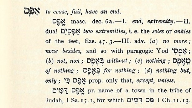 Continue reading “Extremity, extreme part, corner: כַּנְפ֥וֹת – kanaph”To cease, fail, have and end: אַפְסֵי – ephes