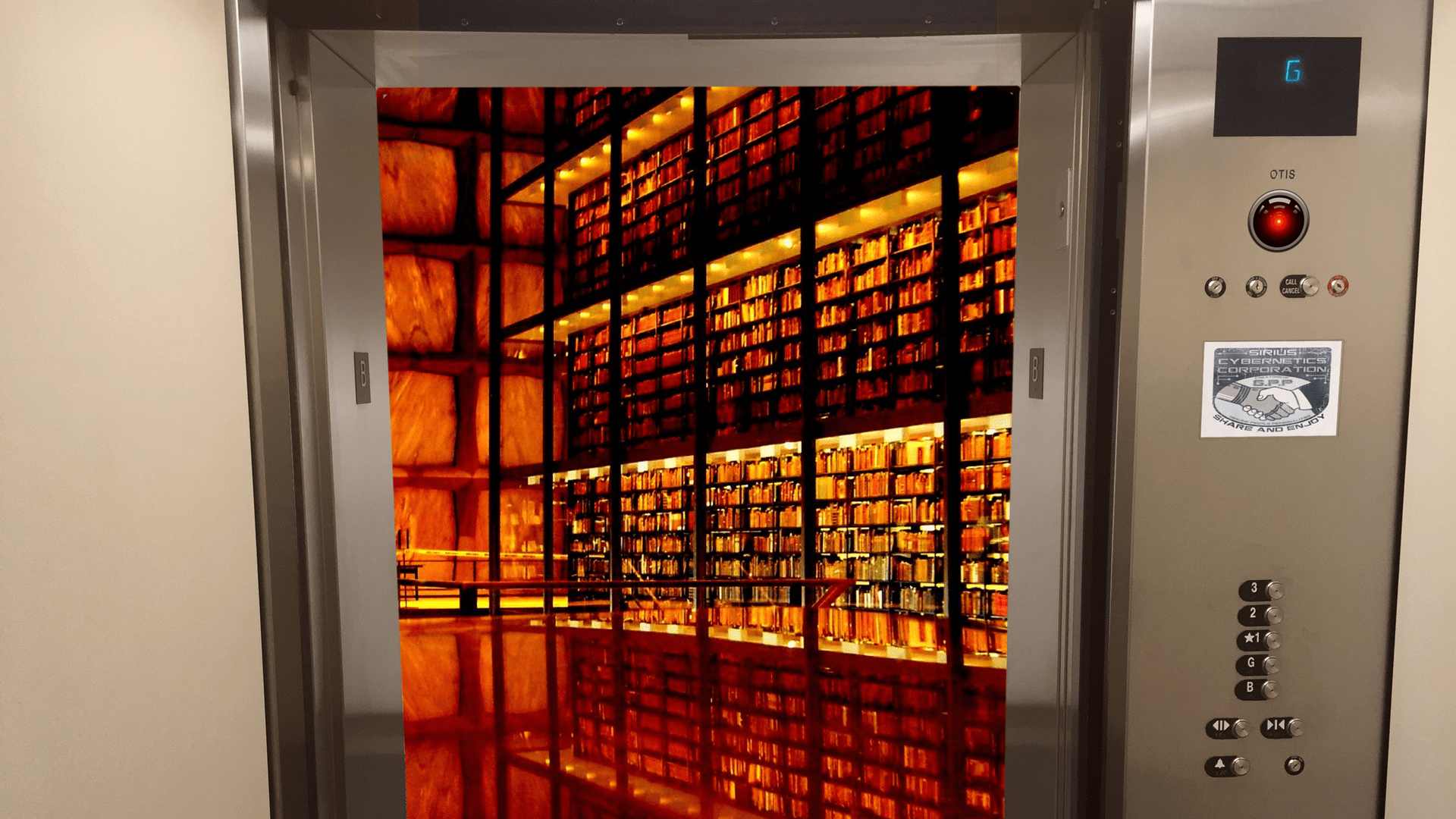 Carlton figured that Rachel must have gotten to the library by now and he was eager to give her the thumb drive so he headed for the elevator to go up to the main lobby. Approaching the elevator reminded him of the conversation he had with it on the way down. He un-clipped his ID badge from his belt and slid it into his pocket. The elevator doors opened before he was within 10 feet, and it gave the impression that the elevator had been waiting for him.